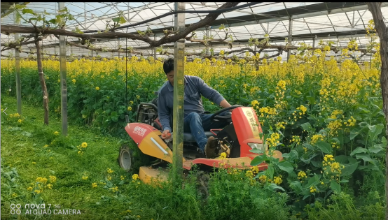 油蔬型油菜种植:①土壤处理:种植油菜前,用小型旋耕机对葡萄行间土壤进行旋耕,至少表层10 cm土壤成细碎状土粒。②播种盖种:在9月下旬至10月下旬间,每亩用种0.25 kg,均匀撒播于旋耕过的土壤上,用九齿耙轻轻划耙盖种,有条件的喷灌浇水,促进出苗。③肥料管理:根据土壤肥力状况,基肥每亩施用20-30 kg复合肥(15:15:15),腊肥每亩施用5 kg尿素。④生产管理:播种不够均匀的,可以适当间苗移栽,一月份根据油菜生长情况,可以适当摘苔食用,油菜盛花期全量粉碎翻入土壤或覆盖土壤表层。