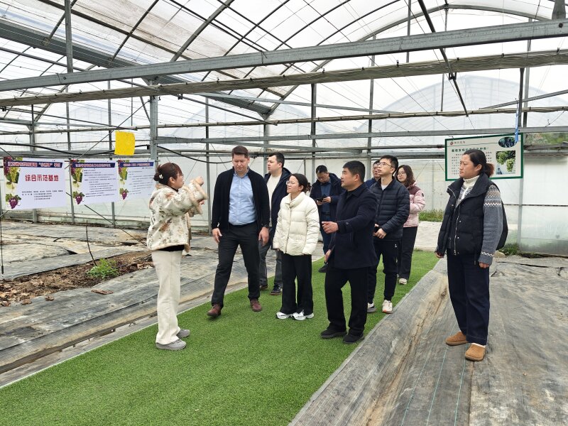随后,考察组一行来到白兔镇张峰良品家庭农场,农场主张奎峰详细介绍了葡萄种植情况、栽培的优良品种以及生态改土强根、生物产品绿色防控等核心种植技术,深入阐释了“养好土、提品质、促增收”的生态种植理念。KIRILL与NIKITA认真聆听介绍,就葡萄品种适应性、生态种植成本控制等问题与张奎峰深入交流,对农场“生态筑基、品质至上”的发展模式给予充分肯定